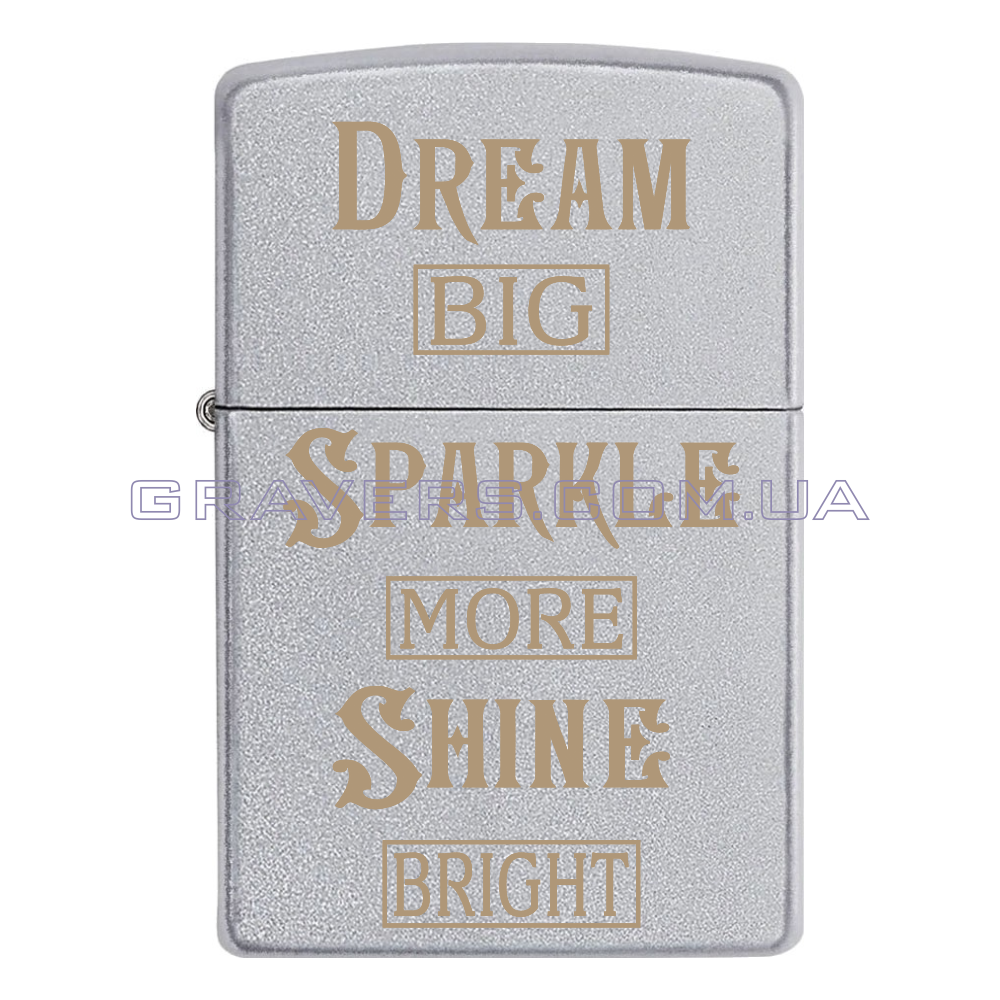 Оригинальная зажигалка Zippo Classic Chrome - классическая бензиновая зажигалка Zippo серебристого цвета с индивидуальной гравировкой надписи «Dream big sparkle more shine bright»