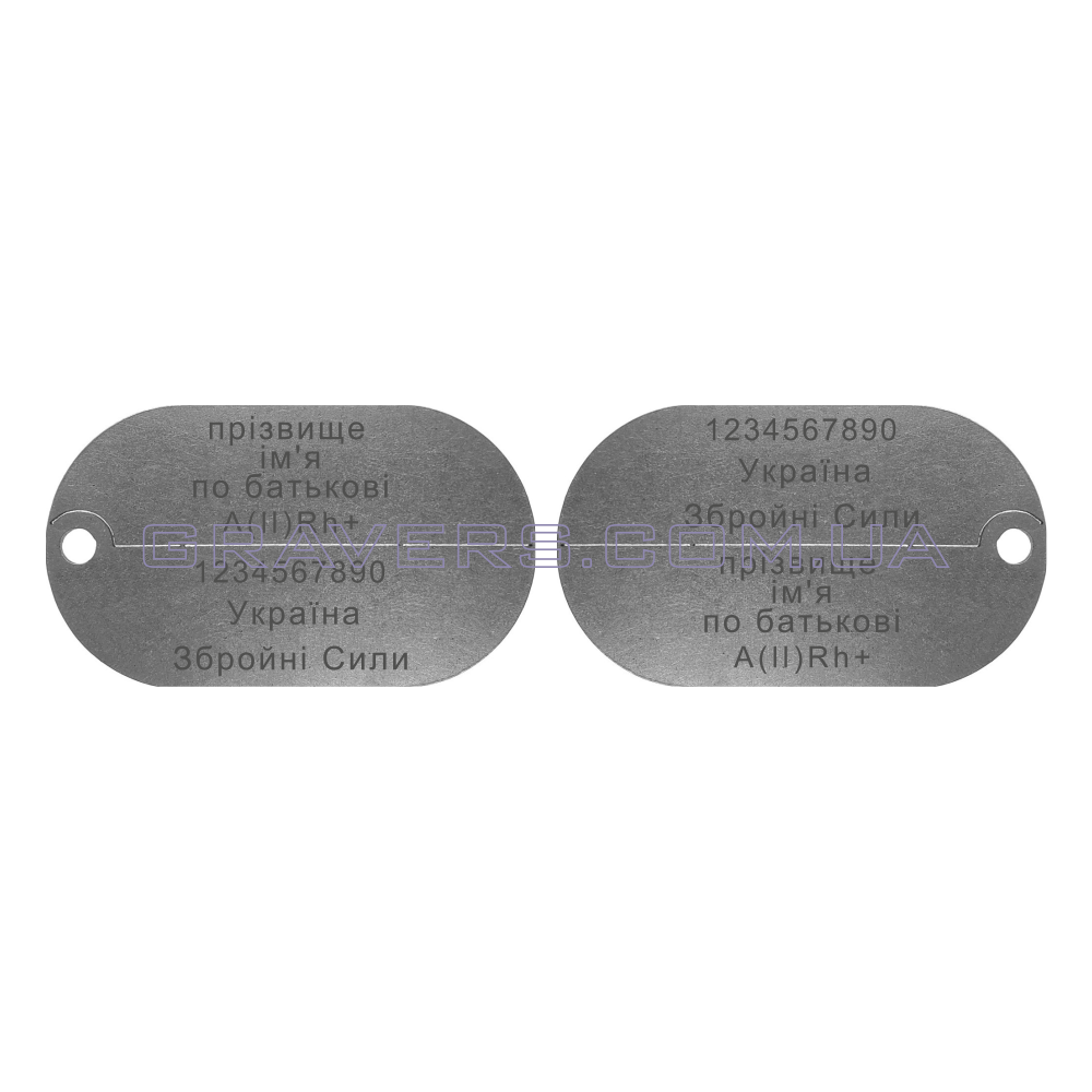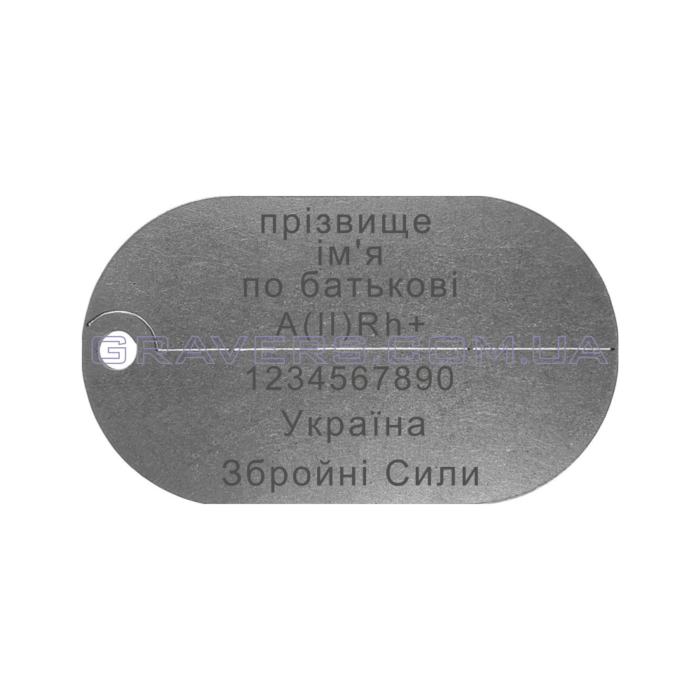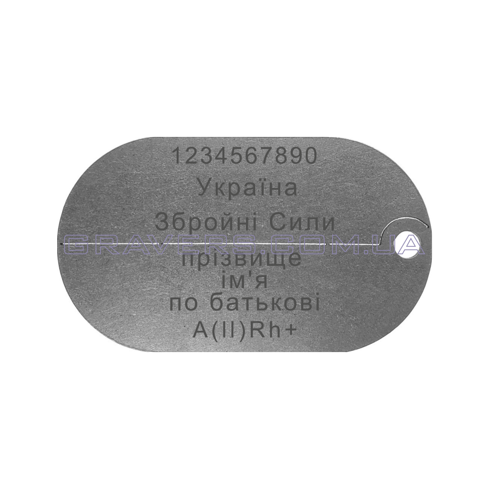 Жетон ЗСУ (Україна Збройні Сили) з нержавіючої сталі розмірами 45мм х 26мм х 1мм, посередині проходить перфораційна лінія. На жетоні зазначаються прізвище, ім'я, по батькові військовослужбовця, його група крові, резус-фактор та особистий номер, присвоєний відповідно до його реєстраційного номера. Інформація про особистість військовослужбовця розміщується з обох боків жетона (рис. 1).